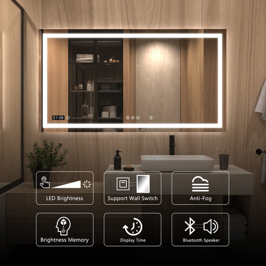 60"*36"LED Wall Mounted Backlit Vanity Framed Bathroom LED Lighted Mirror With Clock And Bluetooth